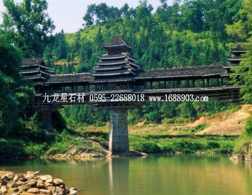 中國廣西省程陽風(fēng)雨橋是最著名的屋頂結(jié)構(gòu)橋,建造于1916年。主要是由木頭和石材建造而成,風(fēng)雨橋總長度為213英尺(約65米),橫跨林溪河。