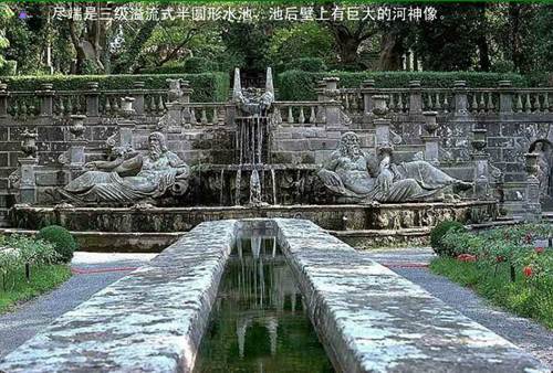 踏上三層臺(tái)地后順著長方形水池向半圓形噴泉望去。站在這一觀賞點(diǎn)總能給人驚喜,就像整幅油畫掛在眼前。兩個(gè)巨大河神分守兩旁的半圓形水池顯得那么的神秘幽深,配以長方形水渠,就像回到了過去。