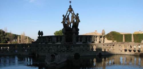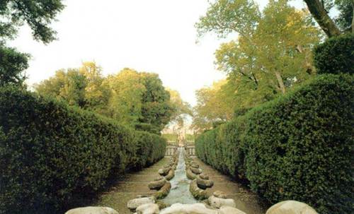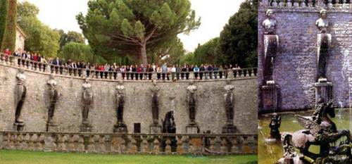 噴泉:蒙塔爾托主教入主別墅時(shí)期,他按照當(dāng)年維尼奧拉的整體設(shè)計(jì),繼續(xù)建造花園的中央噴泉--意大利風(fēng)格主義雕塑家詹博洛尼亞(1529-1608)設(shè)計(jì)建造的"摩爾噴泉":4個(gè)石欄圍繞的水池,石欄上矗立著石雕花瓶,4個(gè)水池中央便是一組高聳的年輕運(yùn)動(dòng)員的輝煌雕塑,他們高高舉起象征著蒙塔爾托主教家族姓氏的"阿爾托山"。從遠(yuǎn)處看去,這些有力的塑像十分宏大,黑黝黝地閃耀,以至于人們會(huì)認(rèn)為它們是青銅,可是難以置信的是,它們是最好的、最堅(jiān)硬的石灰華在陽光與水的作用下生成的一種堅(jiān)硬如鐵的物質(zhì)。后來意大利新古典主義雕塑大師卡諾瓦來到這里時(shí),大為驚訝,他一邊拿起錘子輕輕敲打著它,一邊發(fā)出如此的感嘆:"它將比大理石更長久"。