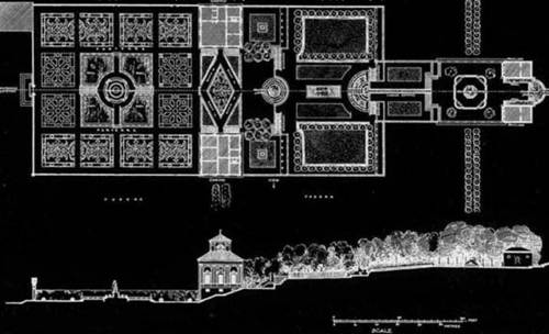 莊園坐落在向北的緩坡山腰處,四周圍墻將其與園外的林地分開。整座莊園成長方形,長約240m,寬約75m,高差約為5m,由四層臺(tái)地組成,構(gòu)成四個(gè)方形單元空間。一層臺(tái)地園路為石鋪道路,并以大面積花壇布置;二層臺(tái)地建筑物占據(jù)一半以上面積,而三層臺(tái)階植被為大型喬木,搭配圓形水池,四層有大面積草地。各臺(tái)地均以臺(tái)階連接水景過渡,綠籬成為重要的分隔物,將園內(nèi)外以及園內(nèi)各空間分割開。